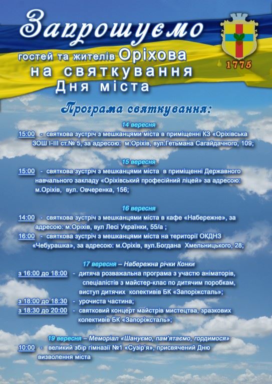Виконавчий комітет Оріхівської міської ради запрошує гостей та жителів Оріхова на святкування Дня міста. Програма святкування: 14 вересня15:00 - святкова зустріч з мешканцями міста в приміщенні КЗ «Оріхівська ЗОШ I-III ст.№ 5, за адресою: м.Оріхів, вул.Гетьмана Сагайдачного, 109; 15 вересня15:00 - святкова зустріч з мешканцями міста в приміщенні Державного навчального закладу…